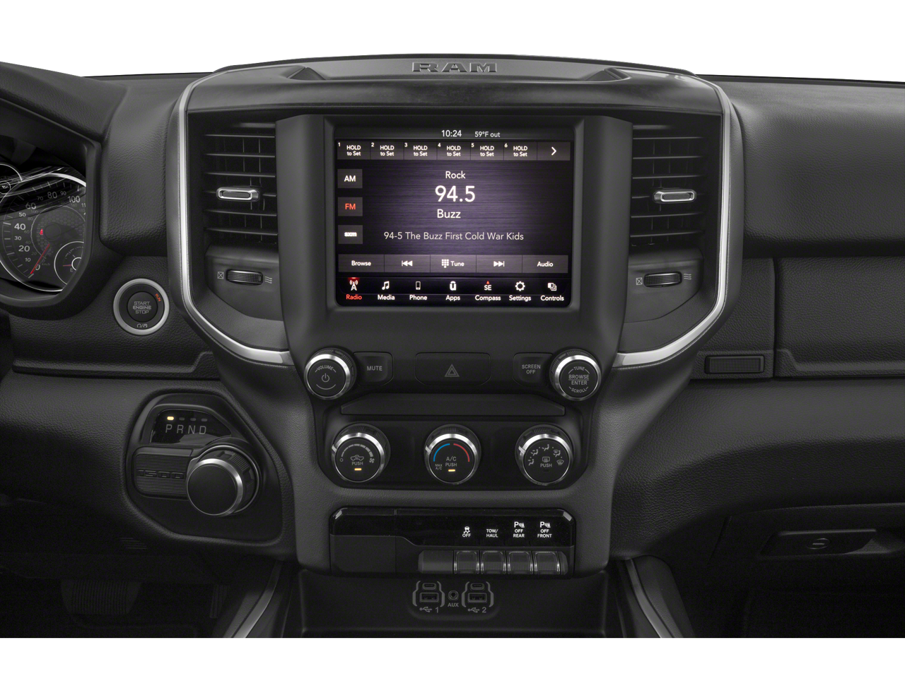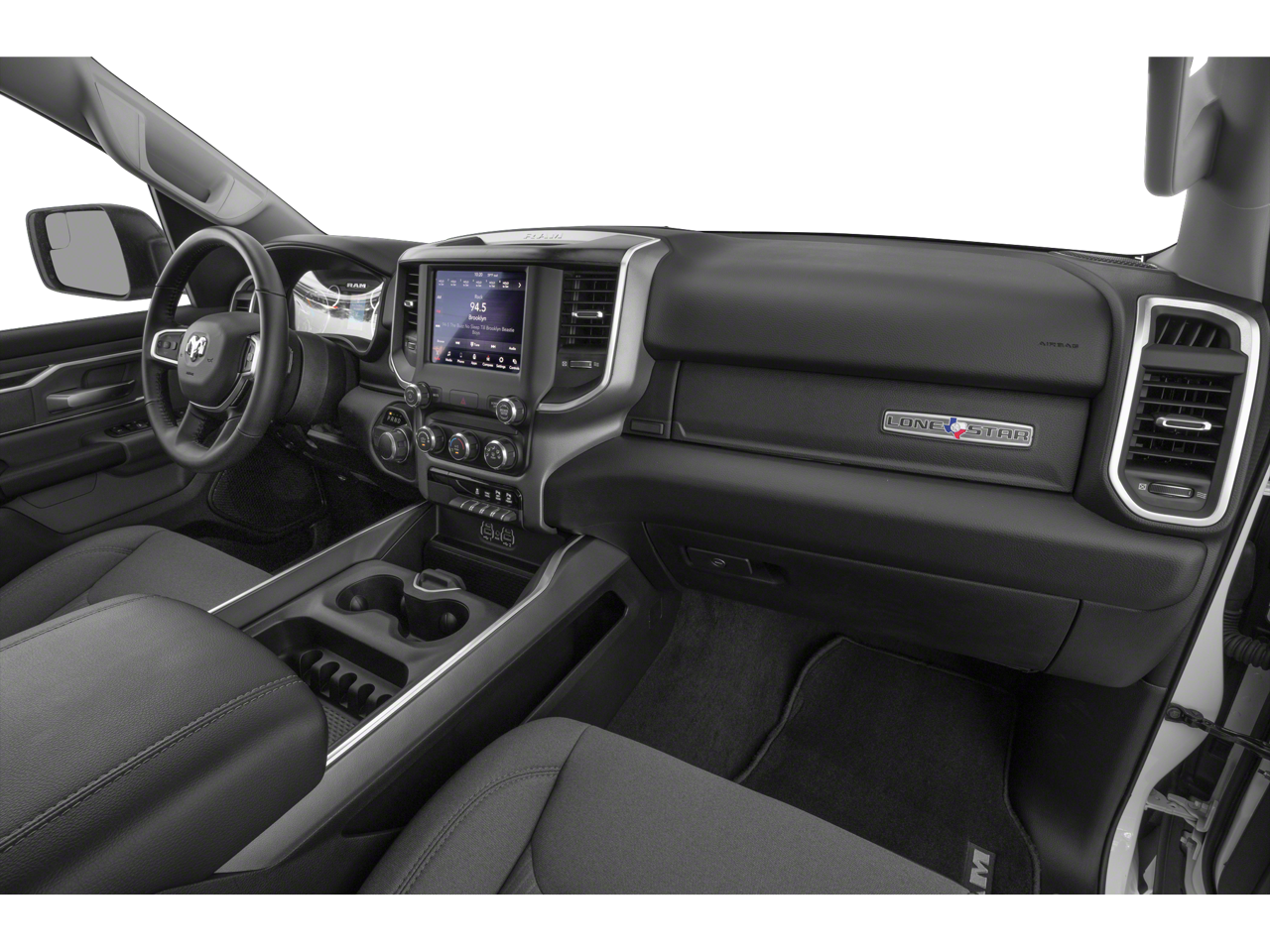 This 1500 is well equipped with Bed Utility Group (4 Adjustable Cargo Tie-Down Hooks, Pick-Up Box Lighting, and Spray In Bedliner), Big Horn Level 2 Equipment Group (115V Auxiliary Power Outlet, 115V Auxiliary Rear Power Outlet, 2 USB Full Function/Charge Only Media Hub, 400W Inverter, 8.4" Touchscreen Display, Air Conditioning ATC w/Dual Zone Control, Auto-Dimming Rear-View Mirror, Big Horn IP Badge, Class IV Receiver Hitch, Cluster 7.0" TFT Color Display, Dampened Tailgate, Foam Bottle Insert (Door Trim Panel), Glove Box Lamp, Heated Front Seats, Heated Steering Wheel, Integrated Center Stack Radio, ParkSense Front/Rear Park Assist w/Stop, Power 4-Way Driver Lumbar Adjust, Power 8-Way Driver Seat, Power Adjustable Pedals, Power Heated Fold Away Mirrors, Radio: Uconnect 4 w/8.4" Display, Rear Dome w/On/Off Switch Lamp, Rear Power Sliding Window, Rear Window Defroster, Remote Start System, Security Alarm, Single Disc Remote CD Player, SiriusXM Satellite Radio, Sun Visors w/Illuminated Vanity Mirrors, and Universal Garage Door Opener), Black Appearance Package (3 Rear Seat Head Restraints, 4 Way Front Headrests, Auto-Dimming Exterior Driver Mirror, Black Exterior Truck Badging, Black Headlamp Bezels, Black Interior Accents, Body Color Door Handles, Body Color Front Bumper, Body Color Rear Bumper w/Step Pads, Bucket Seats, Center Console Parts Module, Deluxe Cloth Bucket Seats, Dual Exhaust w/Black Tips, Exterior Mirrors Courtesy Lamps, Exterior Mirrors w/Memory, Exterior Mirrors w/Supplemental Signals, Front Seat Back Map Pockets, Full Length Floor Console, Grille B/Color Outline 1 Texture 2, Manual Adjust 4-Way Front Passenger Seat, Power Heated Fold-Away Mirrors, Power-Folding Mirrors, Rear 60/40 Folding Seat, and Wheels: 20" x 9" Cast Aluminum Black), Premium Lighting Group (Front LED Fog Lamps, LED Reflector Headlamps, and LED Taillamps), Quick Order Package 23Z Big Horn/Lone Star (Steering Wheel Mounted Audio Controls), 3.21 Rear Axle Ratio, 4-Wheel Disc Brakes, 48V Belt Starter Generator, 6 Speakers, 9 Amplified Speakers w/Subwoofer, ABS brakes, Air Conditioning, Alloy wheels, AM/FM radio, Brake assist, Bumpers: chrome, Cloth Bench Seat, Compass, Delay-off headlights, Dome Dual LED Reading Lamp, Driver door bin, Dual front impact airbags, Dual front side impact airbags, Dual-Pane Panoramic Sunroof, Electronic Stability Control, Front & Rear Rubber Floor Mats, Front anti-roll bar, Front Center Armrest w/Storage, Front fog lights, Front reading lights, Front wheel independent suspension, Fully automatic headlights, GPS Antenna Input, Heated door mirrors, Illuminated entry, Leather steering wheel, Low tire pressure warning, Manufacturer's Statement of Origin, Occupant sensing airbag, Outside temperature display, Overhead airbag, Overhead console, Overhead LED Lamps, Panic alarm, ParkView Rear Back-Up Camera, Passenger door bin, Passenger vanity mirror, Power door mirrors, Power steering, Power windows, Premium Overhead Console, Radio data system, Radio: Uconnect 3 w/5" Display, Rear anti-roll bar, Rear seat center armrest, Rear step bumper, Rear Underseat Compartment Storage, Rear Wheelhouse Liners, Remote keyless entry, Speed control, Split folding rear seat, Tachometer, Telescoping steering wheel, Tilt steering wheel, Traction control, Tri-Fold Tonneau Cover, Trip computer, Variably intermittent wipers, Voltmeter, and Wheels: 18" x 8".