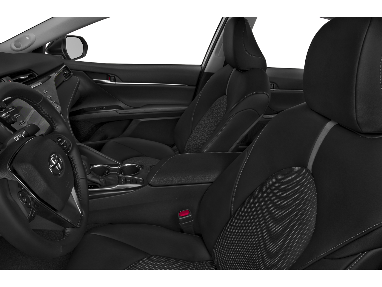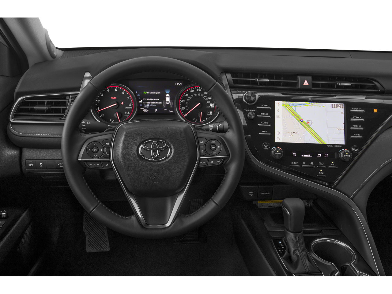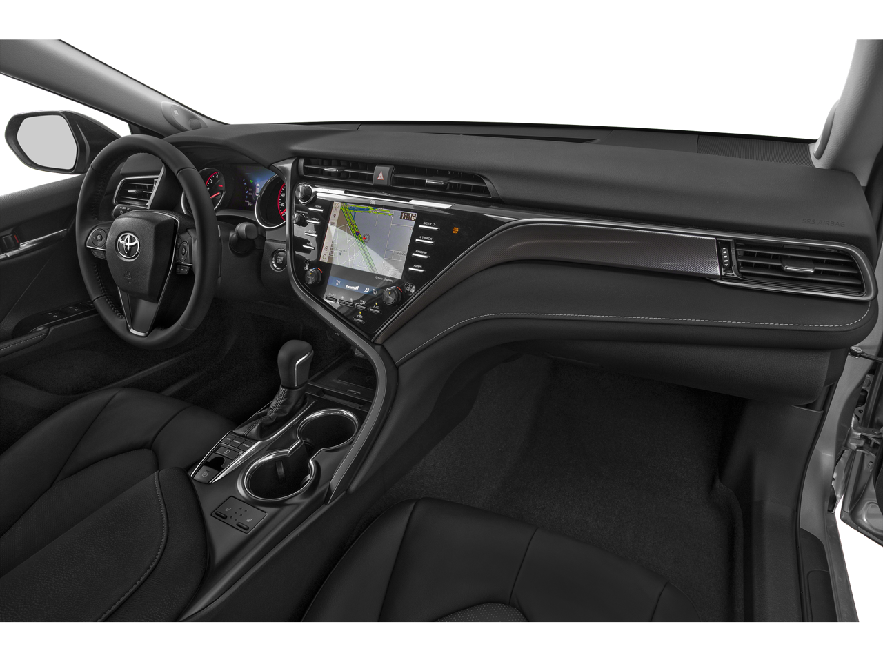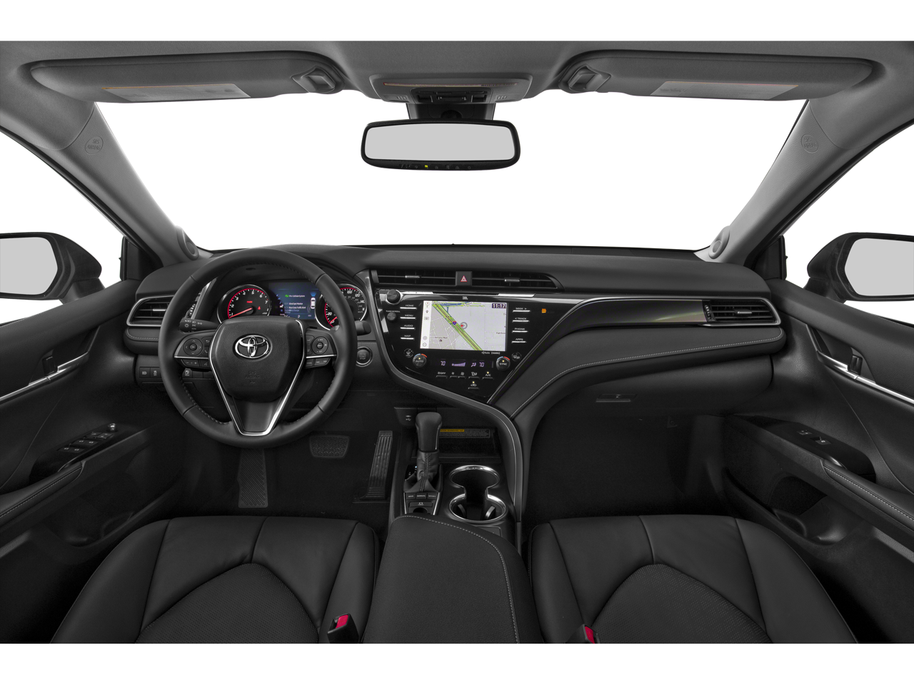 This Camry is well equipped with All-Weather Floor Liner Package, Protection Package (Q2) (Door Sill Protectors and Rear Bumper Applique (Black)), Black Leather, 4-Wheel Disc Brakes, 6 Speakers, ABS brakes, Air Conditioning, Alloy wheels, AM/FM radio: SiriusXM, Apple CarPlay, Auto High-beam Headlights, Auto-dimming Rear-View mirror, Automatic temperature control, Brake assist, Bumpers: body-color, CD player, Compass, Delay-off headlights, Driver door bin, Driver vanity mirror, Dual front impact airbags, Dual front side impact airbags, Electronic Stability Control, Emergency communication system: Safety Connect, Exterior Parking Camera Rear, Four wheel independent suspension, Front anti-roll bar, Front Bucket Seats, Front Center Armrest, Front dual zone A/C, Front reading lights, Fully automatic headlights, Garage door transmitter: HomeLink, Heated door mirrors, Heated front seats, Illuminated entry, Knee airbag, Leather Shift Knob, Low tire pressure warning, Multi-Stage Heated Front Bucket Seats, Occupant sensing airbag, Outside temperature display, Overhead airbag, Overhead console, Panic alarm, Passenger door bin, Passenger vanity mirror, Perforated Leather Seat Trim, Power door mirrors, Power driver seat, Power passenger seat, Power steering, Power windows, Radio data system, Radio: Entune 3.0 Audio Plus w/App Suite, Rear anti-roll bar, Rear reading lights, Rear seat center armrest, Rear side impact airbag, Rear window defroster, Remote keyless entry, Security system, Speed control, Speed-sensing steering, Split folding rear seat, Spoiler, Sport steering wheel, Steering wheel mounted audio controls, Tachometer, Telescoping steering wheel, Tilt steering wheel, Traction control, Trip computer, Turn signal indicator mirrors, Variably intermittent wipers, and Wheels: 8.0J x 19" Black Machined-Finish Alloy.