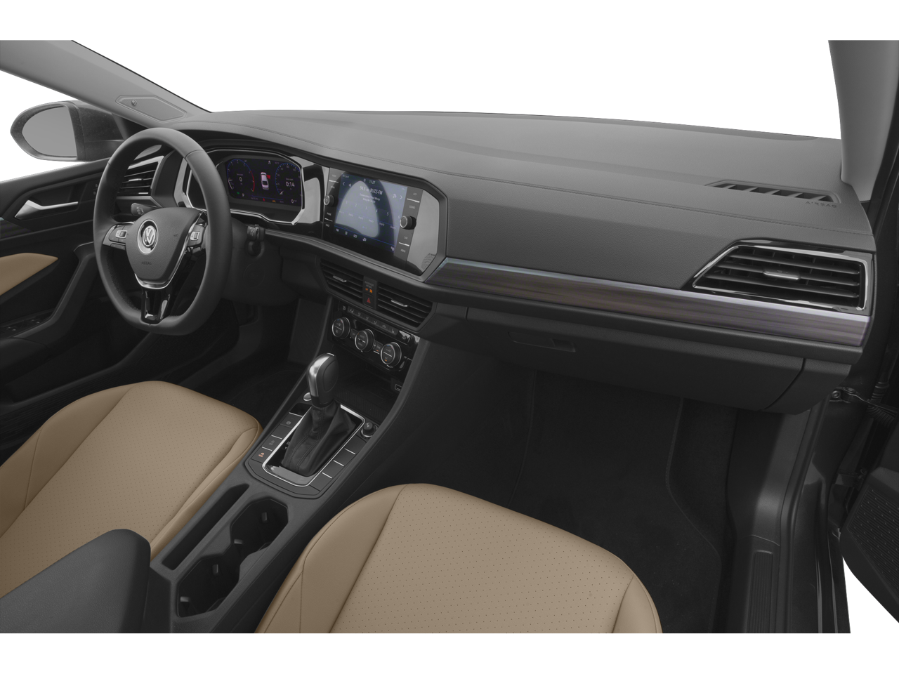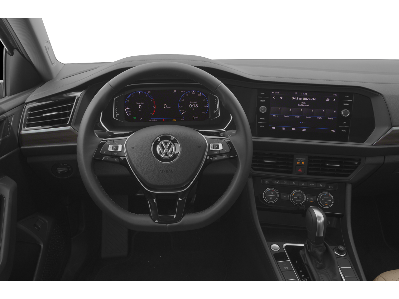 This Jetta is well equipped with 4-Wheel Disc Brakes, 9 Speakers, ABS brakes, Active Blind Spot Monitor, Air Conditioning, Alloy wheels, AM/FM radio: SiriusXM with 360L, Auto High-beam Headlights, Auto-dimming Rear-View mirror, Automatic temperature control, Brake assist, Bumpers: body-color, Delay-off headlights, Driver door bin, Driver vanity mirror, Dual front impact airbags, Dual front side impact airbags, Electronic Stability Control, Emergency communication system: VW Car-Net services (capabilities require enrollment or subscription), Exterior Parking Camera Rear, Front anti-roll bar, Front Bucket Seats, Front Center Armrest, Front dual zone A/C, Front reading lights, Front wheel independent suspension, Fully automatic headlights, Heated door mirrors, Heated Front Comfort Sport Seats, Heated front seats, Heated rear seats, Heated steering wheel, Illuminated entry, Leather Shift Knob, Low tire pressure warning, Occupant sensing airbag, Outside temperature display, Overhead airbag, Overhead console, Panic alarm, Passenger door bin, Passenger vanity mirror, Perforated V-Tex Leatherette Seat Trim, Power door mirrors, Power driver seat, Power moonroof: Panoramic, Power steering, Power windows, Radio data system, Radio: MIB3 Composition Media w/8" Touchscreen, Rain sensing wipers, Rear anti-roll bar, Rear reading lights, Rear seat center armrest, Rear window defroster, Remote CD player, Remote keyless entry, Speed control, Speed-sensing steering, Split folding rear seat, Steering wheel mounted audio controls, Tachometer, Telescoping steering wheel, Tilt steering wheel, Traction control, Trip computer, Variably intermittent wipers, and Wheels: 17" 2-Tone Machined Alloy.