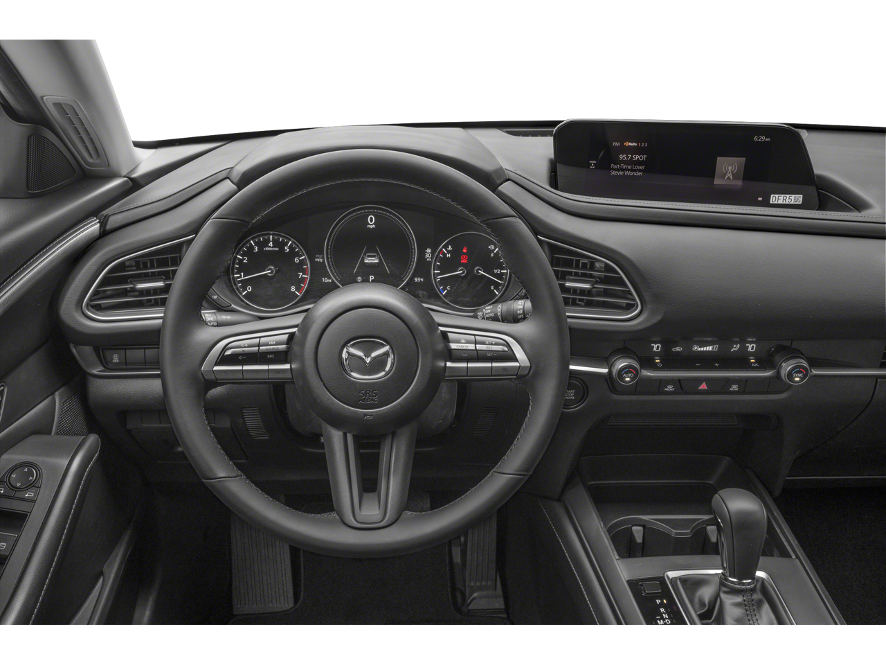 This Mazda CX-30 is well equipped with 4-Wheel Disc Brakes, 4.095 Axle Ratio, 8 Speakers, ABS brakes, Air Conditioning, Alloy wheels, AM/FM radio, AppLink/Apple CarPlay and Android Auto, Auto High-beam Headlights, Automatic temperature control, Brake assist, Bumpers: body-color, Compass, Delay-off headlights, Driver door bin, Driver vanity mirror, Dual front impact airbags, Dual front side impact airbags, Electronic Stability Control, Emergency communication system: Mazda Connected Services (3-year complimentary trial included), Exterior Parking Camera Rear, Front anti-roll bar, Front Bucket Seats, Front Center Armrest, Front dual zone A/C, Front reading lights, Front wheel independent suspension, Fully automatic headlights, Illuminated entry, Knee airbag, Leather Shift Knob, Leather steering wheel, Leatherette Seat Trim, Low tire pressure warning, MAZDA CONNECT Infotainment System, Occupant sensing airbag, Outside temperature display, Overhead airbag, Panic alarm, Passenger door bin, Passenger vanity mirror, Power door mirrors, Power steering, Power windows, Radio data system, Radio: AM/FM/HD Audio System, Rain sensing wipers, Rear seat center armrest, Rear side impact airbag, Rear window defroster, Rear window wiper, Remote keyless entry, Soul Red Crystal Metallic Paint, Speed control, Speed-sensing steering, Split folding rear seat, Spoiler, Steering wheel mounted audio controls, Tachometer, Telescoping steering wheel, Tilt steering wheel, Traction control, Trip computer, Turn signal indicator mirrors, Variably intermittent wipers, and Wheels: 18" x 7J Aluminum Alloy.