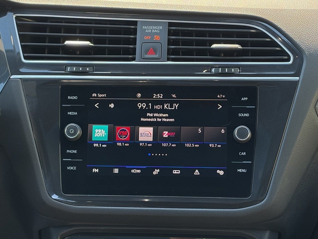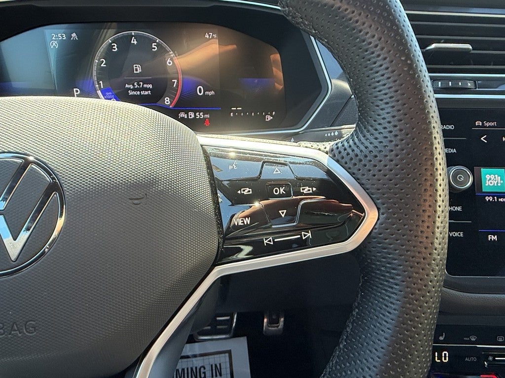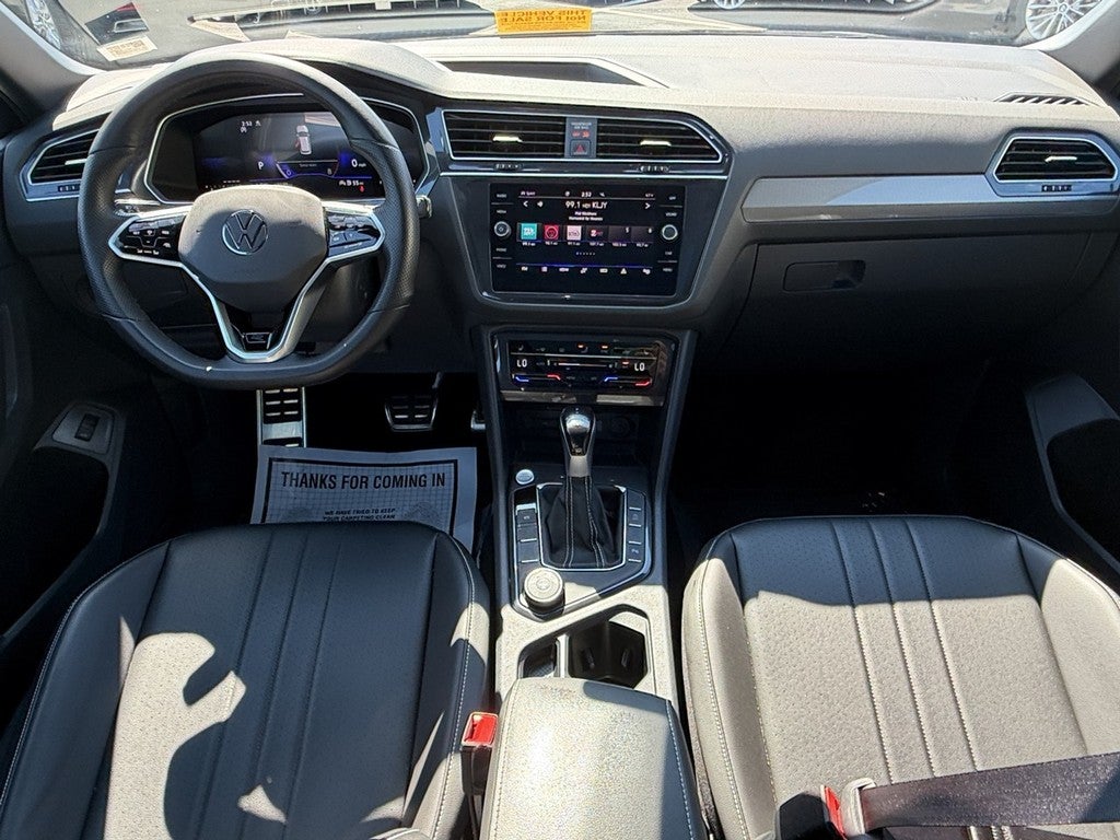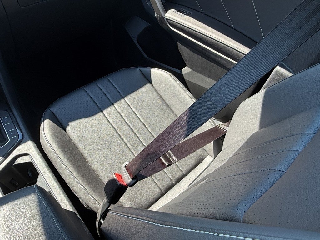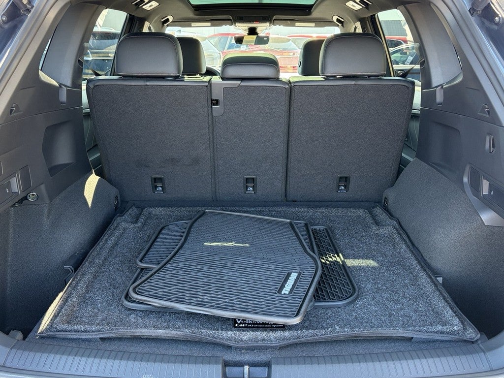 This Tiguan is well equipped with AWD, 3.33 Axle Ratio, 4-Wheel Disc Brakes, 4-Wheel Independent Suspension, 6 Speakers, ABS brakes, Air Conditioning, Alloy wheels, AM/FM radio: SiriusXM with 360L, Auto-dimming Rear-View mirror, Automatic temperature control, Brake assist, Bumpers: body-color, Compass, Delay-off headlights, Driver door bin, Driver vanity mirror, Dual front impact airbags, Dual front side impact airbags, Electronic Stability Control, Emergency communication system: VW Car-Net Safe & Secure 5-year, Exterior Parking Camera Rear, Four wheel independent suspension, Front anti-roll bar, Front Bucket Seats, Front Center Armrest, Front dual zone A/C, Front reading lights, Fully automatic headlights, Heated door mirrors, Heated Front Seats, Heated front seats, Illuminated entry, Leather Shift Knob, Leather steering wheel, Low tire pressure warning, Occupant sensing airbag, Outside temperature display, Overhead airbag, Overhead console, Panic alarm, Passenger door bin, Passenger vanity mirror, Perforated V-Tex Leatherette Seating Surfaces, Power door mirrors, Power driver seat, Power Liftgate, Power moonroof, Power steering, Power windows, Radio data system, Radio: MIB3 Composition Media AM/FM/HD, Rain sensing wipers, Rear anti-roll bar, Rear reading lights, Rear seat center armrest, Rear window defroster, Rear window wiper, Remote keyless entry, Security system, Speed control, Speed-sensing steering, Split folding rear seat, Spoiler, Sport steering wheel, Steering wheel mounted audio controls, Tachometer, Telescoping steering wheel, Tilt steering wheel, Traction control, Trip computer, Turn signal indicator mirrors, Variably intermittent wipers, and Wheels: 19" Black Painted Twin 5-Spoke Alloy.