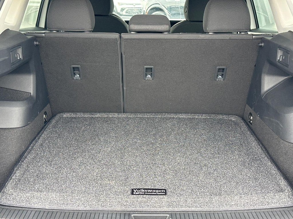 This Tiguan is well equipped with 4-Wheel Disc Brakes, 4-Wheel Independent Suspension, 7 Speakers, ABS brakes, Air Conditioning, Alloy wheels, AM/FM radio: SiriusXM with 360L, Auto High-beam Headlights, Automatic temperature control, Brake assist, Bumpers: body-color, Carpeted Mats Kit (Set of 4), Cloth Seating Surfaces, Compass, Delay-off headlights, Driver door bin, Driver vanity mirror, Dual front impact airbags, Dual front side impact airbags, Electronic Stability Control, Emergency communication system: VW Car-Net Safe & Secure 5-year, Exterior Parking Camera Rear, Four wheel independent suspension, Front anti-roll bar, Front Bucket Seats, Front Center Armrest, Front dual zone A/C, Front reading lights, Fully automatic headlights, Heated door mirrors, Heated Front Seats, Heated front seats, Illuminated entry, Knee airbag, Leather Shift Knob, Low tire pressure warning, Occupant sensing airbag, Outside temperature display, Overhead airbag, Overhead console, Panic alarm, Passenger door bin, Passenger vanity mirror, Power door mirrors, Power steering, Power windows, Radio data system, Radio: MIB4 Composition Media Touchscreen AM/FM, Rain sensing wipers, Rear anti-roll bar, Rear reading lights, Rear seat center armrest, Rear side impact airbag, Rear window defroster, Rear window wiper, Remote keyless entry, Speed control, Speed-sensing steering, Split folding rear seat, Spoiler, Steering wheel mounted audio controls, Tachometer, Telescoping steering wheel, Tilt steering wheel, Traction control, Trip computer, Turn signal indicator mirrors, Variably intermittent wipers, VW Care, and Wheels: 17" 2-Tone Machined Alloy.